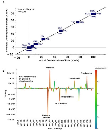 Orthogonal PLS plot (A) and S-line plot (B) to predict the concentration of pork in beef meatballs.
