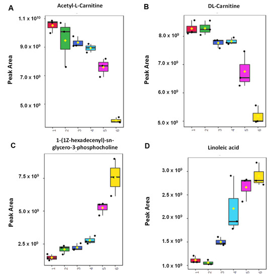 The Box-plot of (A) acetyl-l-carnitine, (B) dl-carnitine, (C) 1-(1Z-hexadecenyl)-sn-glycero-3-phosphocholine, and (D) linoleic acid, obtained from targeted metabolomics analysis using meatball samples containing several concentration levels of pork (1 = 100% beef, 2 = 0.1% pork, 3 = 5% pork, 4 = 25% pork, 5 = 50% pork, 6 = 100% pork).