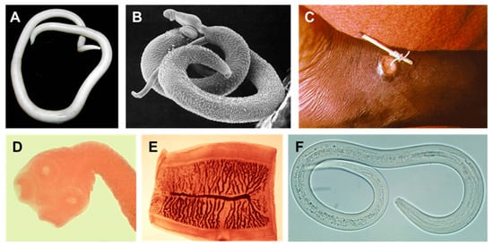 Filarial nematodes are less widespread. The most common infections are lymphatic filariasis (Wuchereria bancrofti and Brugia malayi), onchocerciasis or river blindness (Onchocerca volvulus), loiasis (Loa Loa) and dracunculiasis or Guinea worm disease (Dracunculus medinensis) [1]. Filarial nematodes require an arthropod intermediate host, such as a mosquito or a blackfly, with the exception of D. medinensis, which is not a true filarial nematode [27]. Lymphatic filariasis and onchocerciasis are, respectively, responsible for 120 million and 21 million infections worldwide and for a total burden of 7.3 million DALYs. Wuchereria bancrofti is the leading cause of lymphatic filariasis (90% of cases) and has been confirmed to be endemic in 76 countries [38]. Death is uncommon; instead, both diseases cause high morbidity in the form of elephantiasis and blindness, respectively [3,39,40]. An estimated 44 million people suffer from overt morbidities connected to W. bancrofti [38]. Guinea worm disease is on the verge of eradication, with only 54 cases reported in 2019 [41].