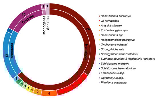 Helminth infections are not solely limited to humans but are widespread among all vertebrates. Of the estimated 76,930 helminth species, 1555 infect cartilaginous fish, 14,154 infect bony fish, 4225 infect amphibians, 11,486 infect reptilians, 33,849 infect birds, and 11,631 infect mammals [23]. Of special economic and societal importance are those helminth species that infect livestock. Helminthoses are a major cause of livestock production loss worldwide [51], the main reasons being direct damage caused by helminths, energy use for immune defense and reduced food intake by infected cattle. These manifest themselves in the form of reduced milk production, carcass weight and reproduction [52]. The worldwide impact is difficult to assess, but gastro-intestinal nematodes are the cause of the livestock diseases with the greatest impact on the poor [53]. Common veterinary helminths are the nematodes Ostertagia ostertagi (cattle), Haemonchus contortus (sheep and cattle), Teladorsagia circumcincta (sheep and goats), Dictyocaulus viviparus (ruminants), Ascaris suum (pigs) and the trematode Fasciola hepatica (sheep and cattle) [52,54]. Aside from food production, food safety is also a concern, as livestock can act as intermediate hosts for some infections. For example, the tapeworms T. saginata and T. solium are transmitted to humans through the ingestion of undercooked meat [12]. Some helminths, such as the liver flukes F. hepatica and F. gigantica, are able to infect livestock as well as humans [53]. Ascaris suum, the large roundworm of pig, might be the same species as A. lumbricoides, the foremost human roundworm parasite [55]. Treatment of these helminths in livestock could help limit future infection in humans. Climate change will likely cause a shift in the prevalence and intensity of helminthoses. In order to maintain food production, adapted preventative and treatment measures are necessary [56,57].