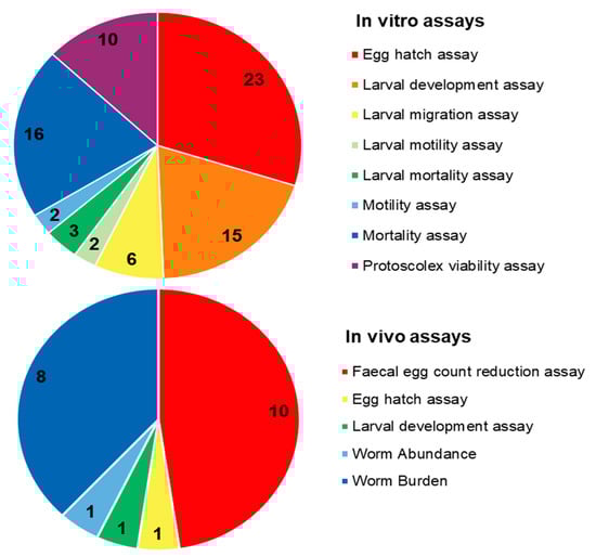 Distribution of different anthelminthic assay methods in in vitro and in vivo experiments.