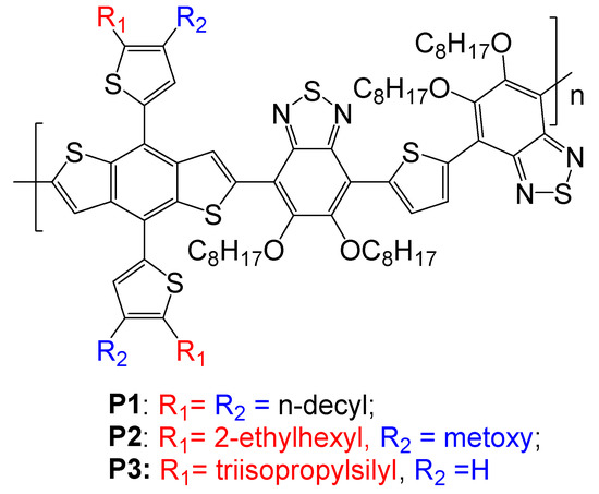 Here, we report the synthesis of three novel BDT-based conjugated polymers and the investigation of these compounds, such as HTMs in PSCs. The polymers P1–P3 were designed according to the push–pull concept by combining BDT moieties bearing different alkyl side chains with benzothiadiazole acceptor and thiophene donor moieties to ensure favorable electronic and physicochemical characteristics, e.g., deep HOMO energy level, high charge mobilities, good solubility, and film formation properties (Figure 1).