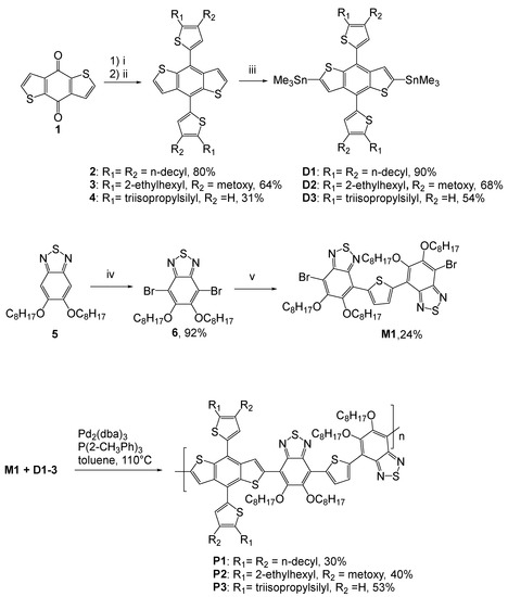 Synthesis of monomers D1–D3, M1 and conjugated polymers P1–P3. Conditions: i—(4,5-didecylthien-2-yl)lithium or (4-(2-ethylhexyl)-5-(methoxy)thien-2-yl)lithium or (5-(triisopropylsilyl)thien-2-yl)lithium, THF; ii—SnCl2•2H2O, 10% HCl; iii—BuLi, −78 °C, THF, TMEDA, SnMe3Cl; iv—Br2, AcOH, 60 °C; v—2,5-bis(trimethylstannyl)thiophene, toluene, 110 °C, Pd(PPh3)4.