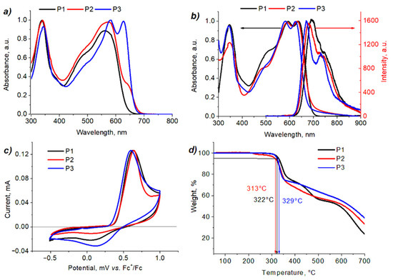 Absorption spectra of polymers P1–P3 in 1,2-dichlorobenzene solution (a); absorption and emission spectra of thin films (b); cyclic voltammograms of polymer thin films (supporting electrolyte—0.1 M Bu4NPF6 in acetonitrile, scan rate—50 mVs−1, glassy carbon disc electrode) (c); TGA curves of polymers P1–P3 (d).