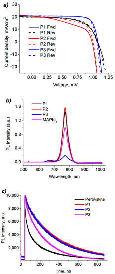 J-V curves of PSCs fabricated under optimized conditions (a); steady-state PL spectra for glass/perovskite/HTM stacks (b); time-resolved PL measurements of the perovskite films deposited on the P1–P3 HTMs (c).