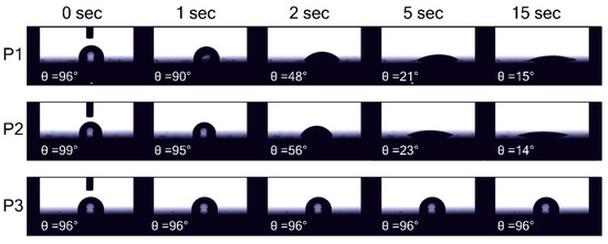 To evaluate the hydrophobicity and quality of coverage provided by polymers, we measured further the contact angle (θ) of water on the surface of P1–P3 films deposited on perovskite (Figure 5). For all samples, θ = 96–99° at the initial moment suggested the hydrophobic nature of the films. It can be seen that θ values for P3 film did not change with time, while for P1 and P2-based samples, the θ values rapidly decreased, indicating the interaction of water with the more hydrophilic perovskite layer. The measurements of contact angles on glass/polymer substrates showed similar results, with θ = 32–38° for P1 and P2, and θ≈107° for P3 (Figure S10). Optical microscopy examination of the substrates allowed us to note the circles, which appeared due to the reconstruction of the polymer layer after water deposition. In this case, the polymer film reconstruction facilitates contact between water and glass (Figure S11a). At the same time, neither defects nor similar circles form on the perovskite/P3 layer. To explore further polymer film reconstruction, the microphotographs of the samples glass/perovskite/P1–P3 just after water drop deposition were collected (Figure S11b). The spots on the surface of P1 and P2-based samples exposed to water are separated from undamaged perovskite by the rather thick boundary similar to the ones observed for perovskite-free samples. As for P3, there is a comparatively small area where perovskite is in contact with water and no similar boundaries appeared. Thus, we assume that the adhesion of polymer P3 to perovskite is strong enough to prevent its delamination and parting.