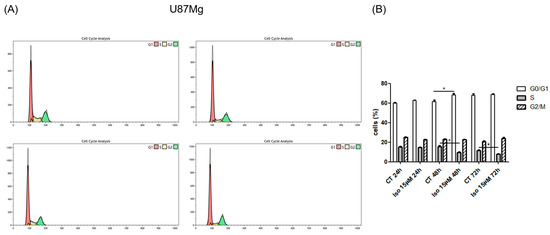 (A) Representative images of FACS analysis in U87MG cells at 48 and 72 h of treatment with Iso 15 µM. (B) Percentages of U87MG cells in the different phases of the cell cycle after treatment with Iso 15 µM: isoginkgetin causes a decrease of the cells in S phase and an increase in G2 phase at 48 and 72 h of treatment. Values are the means ± SEM of three individual measurements: unpaired t-test, one-way ANOVA test, Bonferroni’s multiple comparison test, p-values < 0.05. According to GraphPad Prism, * p value 0.01 to 0.05 (significant).