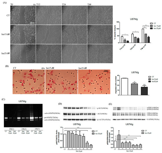 (A) Wound healing assay in U87MG treated with Iso 15 and 25 µM: the closure of the scratch area in treated cells is less than in control cells, at all observed times (scale bar 500 µm). (B) Migration assay in U87MG treated with Iso 15 and 25 µM for 48 h: the number of migrated cells in the treated U87MG is lower than in the controls (scale bar 50 µm). (C) Zymography assay in culture medium collected from U87MG after 24 h of induction with Iso 15 and 25 µM: in treated cells isoginkgetin reduces the enzymatic activity of MMP9 (83 kDa), proMMP2 (72 kDa), and activeMMP2 (66 kDa) compared to control cells. (D,E) Western blot analysis of pAKT and pERK1/2 in U87MG after a short-term treatment with Iso 25 µM: Isoginkgetin significantly reduces the levels of phosphorylated AKT only at 12 and 24 h oh treatment (D) and reduces the levels of phosphorylated ERK1/2 already at 6 h of treatment (E). Values are the means ± SEM of three individual experiments. Unpaired t-test, one-way ANOVA test, Bonferroni’s multiple comparison test, * p values < 0.05. According to GraphPad Prism, ** p value 0.001 to 0.01 (very significant), *** p value 0.0001 to 0.001 (extremely significant).