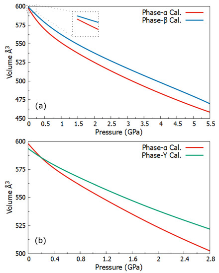 The ab initio calculated change in volume for three phases of p-Tol2S2 with respect to pressure, all curves were fitted with the Bezier function. (a) Shows volume change in phases α and β by increasing pressure from atmospheric to 5.5 GPa. (b) Shows volume change in phases α and γ by increasing pressure from atmospheric to 2.8 GPa.
