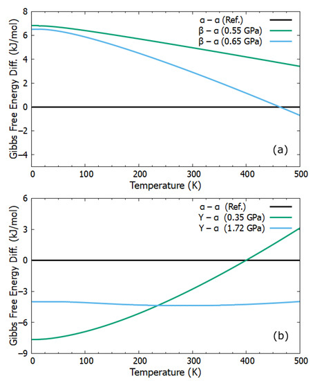 We can observe that as pressure increased, the volumes of the two phases α and β decreased almost similarly, as shown in Figure 2a. No abrupt change in volumes of the two phases was observed. Therefore, phase transition between phases α and β was not directly related to the change in volumes corresponding to pressure. In contrast, the phase transition between α and γ was observed to be related to volume change due to pressure. From Figure 2b we can see the sudden drop in the volume of phase α as pressure was raised from 0 GPa to 0.35 GPa. This drop was likely due to compression of the short intermolecular contacts, which led to phase transition between phases α and γ. These results were also consistent with the experimental results presented by Sobczak and Katrusiak [25]. Next, we present the effect of high pressure on Gibbs free energies of three phases of p-Tol2S2.