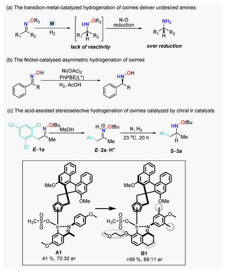 (a) The transition-metal-catalyzed hydrogenation of oximes deliver undesired amines [3], (b) the Nickel-catalyzed asymmetric hydrogenation of oximes [9] and (c) the acid-assisted stereoselective hydrogenation of oximes catalyzed by chiral Ir catalysts [10].