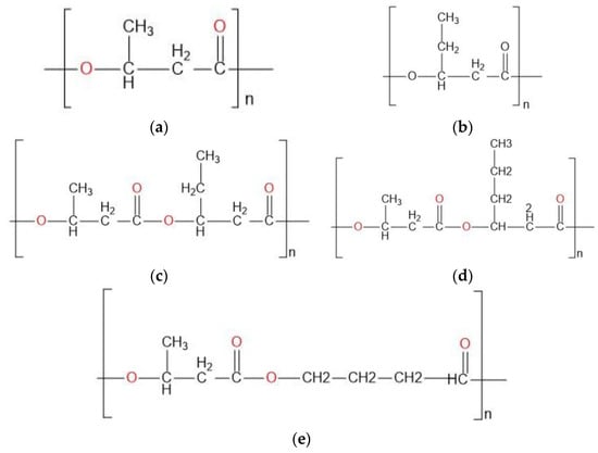 Polyhydroxyalkanoates used in industry. (a) Polyhydroxybutyrate (PHB); (b) Polyhydroxyvalerate (PHV); (c) Poly (3-hydroxybutyrate-co-3-hydroxyvalerate)(PHBV); (d) Poly (3-hydroxybutyrate-co-3-hydroxyhexanoate; P(3HB-co-3HHx)); (e) Poly (3-hydroxybutyrate-co-4-hydroxybutyrate) (P(3HB-co-4HB)).