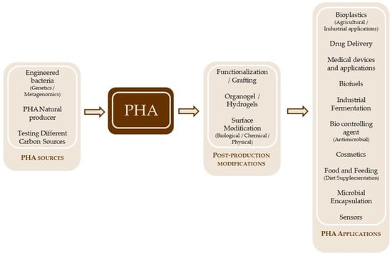 The importance of PHA relies on the fact that the degradation products (by a microorganism, such as bacteria and fungi) are not toxic to the environment because the final products are CO2 and water under aerobic conditions or as CO2 and methane during anaerobic conditions [19,20].