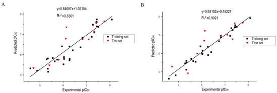 Scatter plots of experimental pIC50 values and predicted pIC50 values for CoMFA model (A) and CoMSIA model (B).