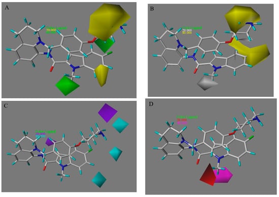 The CoMSIA model contour maps with compound 18x as the reference. (A) The steric field. (B) The hydrophobic field. (C) The hydrogen bond donor field. (D) The hydrogen bond acceptor field.