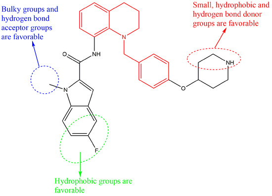 The compound 18x with IC50 = 0.54 µM, which exhibited superior drug properties, was selected as a template. The structure–activity relationship (SAR) information is summarized in Figure 5. As mentioned in Section 2.2, the introduction of small hydrophobic and hydrogen-bonding donor groups in the red region will enhance of inhibitor activity. Similarly, it is favorable to introduce appropriate hydrophobic groups in the green region. For the blue circle region, the bulky, hydrophilic, as well as hydrogen bonding acceptor group could be introduced. As mentioned before, the halogen elements (F and Cl atoms) and -NH2 groups were introduced into the red region, the F atom and methyl group were introduced into the green region, and the -NH2 and -OH groups were introduced into the blue region. Therefore, seven tetrahydroquinoline derivatives (D1, D2, D4, Z5, Z17, P8, and P56) were created.