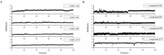 Figure 7 indicates that the superposition of the docking structure and MD average structure during MD equilibrium stage for each system. It was worth noting that the four compounds are still located well in the substrate binding region, which share the same binding mode with a “U-shaped” conformation. Furthermore, the hydrophobic and polar interactions between the compound and surrounding residues are favorable for maintaining the stability of the complex. Amazingly, as shown in Table 5, the hydrogen bonds between the four compounds and the residue Asp555 as well as the arene–cationic interaction between the compound D1 and Phe538 were stable during the MD simulations. Compared with LSD1–18x, during the simulations of LSD1–D1 and LSD1–D4, the hydrogen bonds Asp555=O⋯HN were kept, and the bond energies were almost the same (−13.2 kcal/mol, −13.7 kcal/mol versus −13.3 kcal/mol). Furthermore, due to the introduced -NH2 group, two more stronger H-bonds, namely Glu559=O⋯HN and Pro808=O⋯HN, with a bond energy of −20.1 kcal/mol, −13.3 kcal/mol and −18.2 kcal/mol, −5.8 kcal/mol, were formed for LSD1–D1 and LSD1–D4. However, during the simulation of LSD1–Z17, the H-bond Glu559=O⋯HN disappeared, but the newly formed H-bond Asp555-HO⋯HN was stronger than that of LSD1–18x, with a value of −13.1 kcal/mol. In addition, the last 20 ns of the production trajectory were used to calculate the H-bonds occupancy, and the results are also depicted in Table 5. Most of the H-bonds’ occupancies were over 80%, especially for the mentioned H-bonds of the residues Asp555, Pro888, and Glu559.
