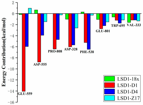 Energy decomposition was carried out to illuminate the weightiness of individual residues in the binding process of the compound to LSD1 (shown in Figure 8). The energy contributions of the most contributive residues (Glu559, Asp555, Pro808, Asp328, Phe538, Glu801, Trp695, and Val333) were summarized in Figure 8. Clearly, compared to complexes LSD1–18x and LSD1–Z17, the residues Glu559, Asp555, Pro808 and Phe538 had better energy contributions to complexes LSD1–D1 and LSD1–D4. This is because LSD1 formed the hydrogen bonds and salt bridges with the introduced groups (-NH2) in the complexes LSD1–D1 and LSD1–D4. Furthermore, the introduction of hydrophobic groups made the compounds more stably bound in the hydrophobic pocket, which consisted of Val333, Phe538, Trp695, and Pro808. The decomposition of binding free energy suggests that Phe538, Asp555, Glu559, and Pro808 might be the key residues in the ligand–receptor binding process, and the hydrophobic interactions are also essential.