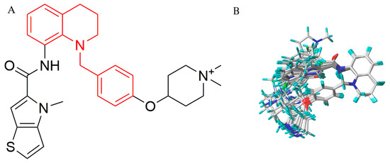 (A) That marked in red is the common skeleton of the compounds and (B) the alignment result of the training set.