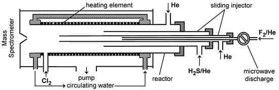 Experiments have been carried out at total pressure of 2 Torr of Helium in a flow tube reactor, employed in the laminar flow regime (Reynolds number < 10), and combined with a modulated molecular beam quadrupole mass spectrometer for the detection of the gas phase species. The experimental setup has been used extensively in the past, in particular, to study the kinetics and products of the reaction involving atomic fluorine [4,5,13,14,15,16]. Briefly, it consists of the gas introduction vacuum lines, the flow tube reactor, and the differentially pumped stainless steel high-vacuum chamber which houses the quadrupole mass spectrometer (Balzers, QMG 420, Balzers Aktiengesellschaft, Liechtenstein). Gas phase molecules sampled from the flow reactor are modulated by a tuning-fork chopper (35 Hz), ionized through impact with high kinetic energy electrons (18–30 eV, in this study) emitted by the ion source of the mass spectrometer and detected using an electron multiplier. Subsequently, the mass spectrometric signals are filtered and amplified with a lock-in amplifier and recorded for further analysis.