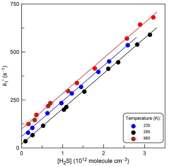 Dependence of the pseudo-first order rate constant, k1′ = k1[H2S], on the concentration of H2S at different temperatures. For clarity, k1′ data at T = 235 and 960 K are Y-shifted by 35 and 50 s−1, respectively.