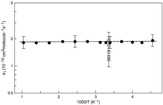 The continuous line in Figure 4 represents an exponential fit to the present data: k1 = (1.83 ± 0.03) × 10−10 exp((7 ± 4)/T) cm3 molecule−1 s−1 with statistical 2σ uncertainties on the precision of the fit. The experimental data for k1 are also well described (dashed line in Figure 4) with a temperature-independent value of k1 = (1.86 ± 0.28) × 10−10 cm3 molecule−1 s−1. We estimate the rate coefficient to be accurate within 15% over the investigated temperature range 220–960 K.