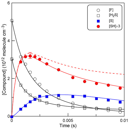 One can note that the kinetics of two reactants, F-atom and H2S, are well described with k1, determined above in an excess of H2S. The SH concentration, as expected, increases to a maximum and then drops due to the loss of SH in Reactions (2), (7) and (10). The dotted line in Figure 5 shows the SH profile calculated without taking into account the SH losses in its self-Reaction (7) and on the wall (10). The relative contribution of these reactions increases with the reaction time (as F-atom is consumed). At the maximum concentration of SH, the impact of these two reactions can be considered negligible (the error bar displayed at the top of the SH profile corresponds to 5%), even for the relatively high initial concentration of H2S used in this experiment. Hence, one can conclude that the maximum concentration of SH is determined with a sufficient degree of accuracy by only two processes, the formation of SH in Reaction (1) and the consumption in Reaction (2), with k1[H2S] = k2[SH]max at the time when [SH] is maximum. We did not perform the above analysis at other temperatures. It was assumed that the aforementioned conclusion is valid over the entire temperature range of the study, since the wall loss of SH does not vary significantly with temperature and the temperature dependence of the SH + SH reaction (unknown) is expected to be weak.