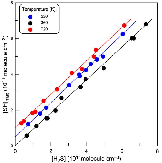 Thus, k2 was determined relative to k1 from the ratio k1/k2 = [SH]max/[H2S]. Experiments consisted of monitoring the concentrations of SH and H2S when [SH] reached its maximum. Examples of the experimental data observed at three different temperatures with varied initial concentration of H2S are shown in Figure 6. The slopes of the straight lines in Figure 6 provide the k1/k2 ratios at respective temperatures. The experimental conditions and the results of these measurements are summarized in Table 2. The values of k2 presented in Table 2 were calculated using k1 = 1.86 × 10−10 cm3 molecule−1 s−1 (T = 220–960 K), determined in the present work.