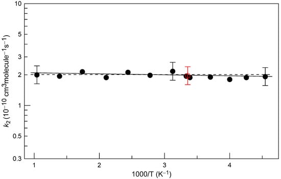 Temperature dependence of k2 is shown in Figure 7. The only value of k2 available in the literature is that reported by Schölne et al. [12]. The authors determined k2 = (2.0 ± 0.4) × 10−10 cm3 molecule−1 s−1 at T = 298 K from modeling SH kinetics in F + H2S system under an excess of F atoms over H2S. Fitting the current experimental data with an exponential function (solid line in Figure 7) yields the following Arrhenius expression: k2 = (2.14 ± 0.09) × 10−10 exp(−(23 ± 14)/T) cm3 molecule−1 s−1 with 2σ uncertainties representing the precision of the fit. The measured rate coefficient is observed to be independent of temperature, with all measured k2-values well within their corresponding uncertainties, k2 = (2.0 ± 0.4) × 10−10 cm3 molecule−1 s−1, in the temperature range of the measurements, T = 220–960 K. This value of k2 is recommended from the present study with a conservative uncertainty of 20% (including the uncertainty on the rate coefficient of the reference reaction).