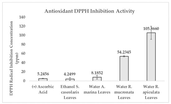 DPPH radical scavenging activity was performed to determine whether the extracts contained antioxidant activity by comparing them against controlled ascorbic acid. Ascorbic acid is capable of rapid radical oxygen species (ROS) elimination, formation inhibition, as well as preventing oxidation pathways [34]. Antioxidant activity was calculated in terms of concentration where DPPH inhibition reached 50% (DPPH IC50). Water-based A. marina leaves extract was able to inhibit DPPH radicals in an equivalent concentration and efficacy as ascorbic acid. Ethanol-based S. caseolaris leaves extract was able to inhibit in a slightly smaller concentration compared to ascorbic acid with the value of 4.2499 ± 3.0506 and 5.2456 ± 0.5937 ppm, respectively, as shown in Figure 1 and Supplementary Table S1. Using the criterion of antioxidant potency performed by Phongpaicit et al., water-based R. mucronata and R. apiculata leaves extracts were considered to contain intermediate and weak antioxidant activity, while ethanol-based S. caseolaris leaves and water-based A. marina leaves extracts were considered as having very strong antioxidant activity [18,35]. Due to the water-based A. marina leaves extract having comparable inhibition efficacy of ascorbic acid while ethanol-based S. caseolaris leaves extract outperformed ascorbic acid; both extracts, and therefore their species, could be considered as having super-antioxidant potential.