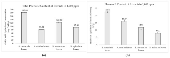 Comparison of: (a) Total Phenolic Content; (b) Flavonoid Content of various local mangrove species extracts dissolved in 1000 ppm. Result values and error bars were plotted in the form of mean ± standard deviation, respectively.