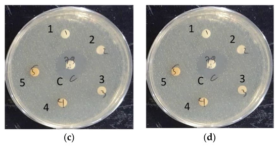 A preliminary test was conducted using a non-sterilized 6 mm diameter 0.22 μm filter paper disk, impregnated with extracts. When the non-sterile extract-impregnated disks were tested against MRSA, the disks were found to be heavily contaminated. This was also the case for the sterilized disks, with all extracts except the ethanol-based S. caseolaris leaves extract. The S. caseolaris leaves extract did not show any inhibition around the disk vicinity, with MRSA colonies growing very near to the impregnated disks (Figure 3a–d). This did not fall in line with what had been reported in an earlier study where the ethanol-based S. caseolaris leaves extract did not show significant S. aureus inhibition. In the aforementioned study, extracts in different solvents were tested against the Gram-negative bacteria Escherichia coli, Pasteurella mosselii, as well as Gram-positive bacteria Propioniumbacterium acnes, S. aureus, and Rhodococcus equi. The S. caseolaris leaves extract was reported to be able to inhibit P. acne with a zone of inhibition (ZOI) diameter of around 8 mm and 7 mm for ethanol- and water-based extracts, respectively. A water-based A. marina leaves extract was reported to inhibit S. aureus growth at around 10.7 mm. Both water-based R. mucronata and R. apiculata leaves extracts were also documented to inhibit S. aureus growth at ZOI 7 mm and 8 mm respectively [16].