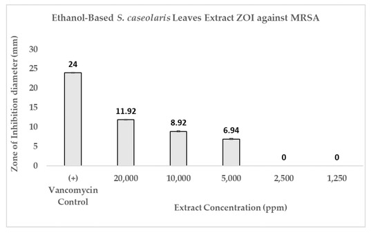 Antibacterial activity of ethanol-based S. caseolaris leaves extract against MRSA strain. Positive control was made from Vancomycin (5 μg), yielding a ZOI diameter of 24 ± 0.1 mm.
