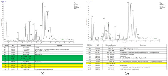 Chromatogram of ethanol-based solvent S. caseolaris leaves extract: (a) run A; (b) run B. Upper panels are chromatogram of LC-MS/MS data and lower panels are list of identified compounds.