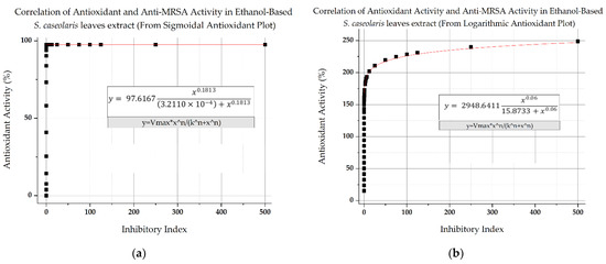 Correlation between antioxidant activity and antibacterial activity of ethanol-based S. caseolaris leaves crude extract against MRSA (a) using an antioxidant activity equation fitted in sigmoidal fitting and (b) in logarithmic fitting.