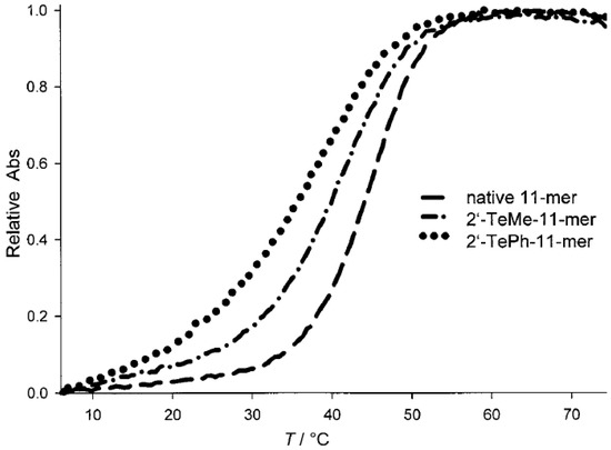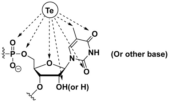 - Sheng, J.; Hassan, A.E.A.; Zhang, W.; Zhou, J.; Xu, B.; Soares, A.S.; Huang, Z. Synthesis, structure and imaging of oligodeoxyribonucleotides with tellurium-nucleobase derivatization. Nucleic Acids Res. 2011, 39, 3962–3971. [Google Scholar] [CrossRef] [PubMed][Green Version]