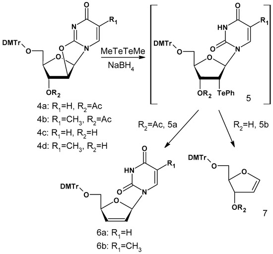 - Sheng, J.; Hassan, A.E.A.; Huang, Z. New Telluride-Mediated Elimination for Novel Synthesis of 2’,3’-Didehydro-2’.3’-dideoxynucleosides. J. Org. Chem. 2008, 73, 3725–3729. [Google Scholar] [CrossRef]