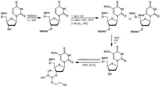 - Sheng, J.; Hassan, A.E.A.; Huang, Z. Synthesis of the First Tellurium-Derivatized Oligonucleotides for Structural and Functional Studies. Chem. Eur. J. 2009, 15, 10210–10216. [Google Scholar] [CrossRef]