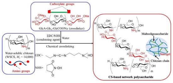 Natural polysaccharides, which consist of monosaccharide units linked through glycosidic bonds, are a major class of biopolymers and are identified as the most abundant organic resources on Earth [1,2]. Due to their controlled specific structures, they have been used for the fabrication of bio-based nanomaterials, such as nanoparticles, nanofibers, and nanogels, via the regular assembly of polymeric chains [3,4,5,6]. For example, polysaccharide-based nanoscopic hydrogels (nanogels) have been prepared via the construction of nanoscale network structures through the chemical or physical crosslinking of polysaccharide chains [7]. Nanogels are submicron-sized hydrogels that are formed via the chemical or physical crosslinking of polymeric chains to afford a three-dimensional (3D) network with water retention properties and no solubility in aqueous media [8]. Chitosan (CS) is one of the most widely used polysaccharide sources for nanogel preparations [9,10]. CS is prepared via the deacetylation of chitin, which is a natural aminopolysaccharide composed of β(1→4)-linked repeating N-acetyl-d-glucosamine units that are abundantly present as exoskeletons in crustaceans and insects [11]. CS-based nanogels have previously been fabricated via the chemical crosslinking of amino groups at the C-2 position with other moieties such as genipin, an iridoid glucoside extracted from the fruit of Gardenia jasminoides [12,13,14]. Physical crosslinking was achieved through the self-assembly of hydrophobically modified CS in water to produce nanogels [15,16,17].