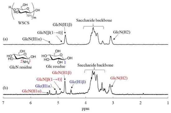 1H NMR spectra of (a) WSCS and (b) CS-based network polysaccharide (run 4) in DCl/D2O.