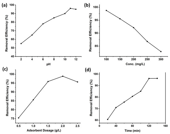 ZIF 67 (2.0 g/L) at pH 11 was used to remove MG from solutions of varying initial concentrations. The relationship between the concentration of MG in the solution and the adsorption capacity of ZIF 67 was also studied (Figure 3c). The test solution was conducted at room temperature (27 °C), pH 11, with varying initial concentrations of ZIF-67 (0.5 to 2.5 g L−1). This shows that the adsorption efficiency of ZIF 67 increased from 0.5 to 2.0 g/L (MG concentration 100 mg/L) and then decreased when adsorbate concentration was increased to 2.5 g/L in the starting solution [32].