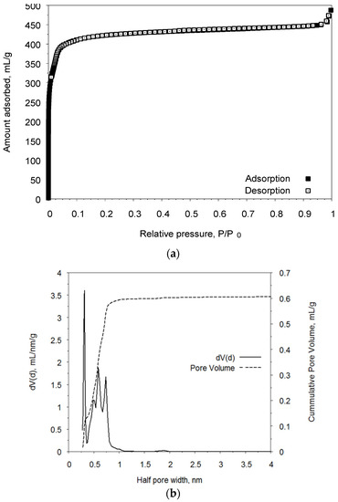The measured isotherm of nitrogen adsorption at 77 K for UiO-66 is represented in Figure 3a. The compound under investigation possesses a type Ia isotherm according to the official IUPAC classification, which is typical for microporous compounds with narrow slit pores.
