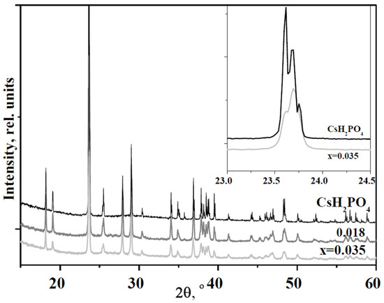 The intensity of the most intensive peak (011) decreases more significantly than the mass fraction of CsH2PO4 in the hybrid compound. The reflexes become broader despite being tested in a humid atmosphere. For example, the intensity of the peaks is more than halved at x = 0.035, while the salt content in the composite is 81 wt%. In addition, the reflexes of CsH2PO4 (P21/m) in the nanocomposites are shifted toward higher angles. The inset shows the change in intensities of the 011 and −111 reflexes in nanocomposites at x = 0.035 versus CsH2PO4 salt. It can be seen that the reflex 2θ = 23.63° is shifted to 23.70° due to a slight decrease in the unit cell parameters of the CsH2PO4 in the UiO-66 polymer matrix. The reduced intensity of the reflexes and their broadening is associated with salt dispersion and partial salt amorphization in the composite. It should be noted that the reflexes of UiO-66 are not noticeable due to the low weight fraction of MOF in the nanocomposite.
