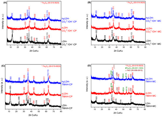 At the same time, the value of c parameter is slightly higher in the case of mechano-chemically obtained samples compared to those obtained by co-precipitation due to the higher amount of embedded Fe3O4 phase. It should be highlighted that the pattern with the most intense diffraction lines is that of the sample obtained in the presence of TMAH, i.e., LDH-TMAH-CP, which also has the lowest value of crystallite size (111 Å). The LDH-TMAH-MC sample contains a high amount of amorphous phase with the largest dimension of crystallite size of 600 Å. The impurity phases, obtained during the synthesis, are probably located in the interlayer space as well as onto the surface of the LDH lamellae, as is suggested by the decreasing of the I003/I110 ratio value, e.g., 4.30 (LDH-CO32−/OH−-CP); 3.50 (LDH-CO32−/OH−-MC); 3.73 (LDH-TMAH-CP); 1.13 (LDH-TMAH-MC) as well as by the shift to lower 2θ values of the 003 diffraction lines (12.6607; 11.9400; 11.7720; 11.2666) [50]. The calcination of LDH samples at 460 °C for 18 h lead to corresponding mixed oxides where Fe3O4 is the prevailing crystalline phase, Figure 1 (red lines). Using TMAH in the mechano-chemical preparation generated more crystalline phases of FexOy, e.g., FeO (ICDD 00-006-0615), Fe2O3 (ICDD 00-001-1053) and Fe3O4 (ICDD 00-019-0629). The presence of these separate oxides in the calcined samples may be a consequence of the co-existence of Fe2+ and Fe3+ amorphous hydroxyl/hydroxycarbonate phases in the parent LDH material. Therefore, it can be concluded that part of Fe2+ is oxidized to Fe3+ and the presence of the organic alkali does not succeed in avoiding the oxidation.