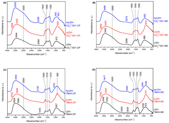 Diffuse reflectance infrared Fourier transform (DRIFT) spectra of the parent LDH (Figure 2, black line) present a large band in the 3700–3400 cm−1 domain corresponding to the vibration of hydroxyl groups, υO-H, while that at 3000 cm−1 is assigned to hydrogen bonds present between carbonate anion and water molecules from the interlayer space [29].