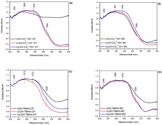 DR-UV-Vis spectra of the materials ((A)—co-precipitation method/inorganic alkali; (B)—mechano-chemical method/inorganic alkali; (C)—co-precipitation method/organic alkali; (D)—mechano-chemical method/organic alkali).