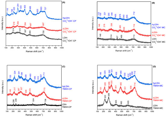 Raman spectra of the materials ((A)—co-precipitation method/inorganic alkali; (B)—mechano-chemical method/inorganic alkali; (C)—co-precipitation method/organic alkali; (D)—mechano-chemical method/organic alkali).