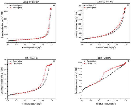 All the samples showed a Type IV adsorption–desorption isotherm with a shape characteristic to mesoporous materials (Figure 5). Only LDH-TMAH-MC showed a deviation from the traditional shape due to the presence of a mixture of amorphous phases.