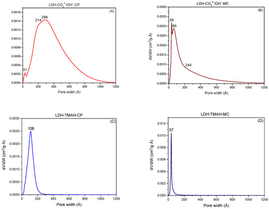 In addition to the hydrolysis agent activity, TMAH also behaves in the synthesis of LDH as a template molecule that generates a porosity that does not exceed the value of 200 Å, while inorganic alkalis generate porosity on a wide range up to 1200 Å (Figure 6). If in the case of mechanochemically obtained materials there is only one domain of pores of 108 Å for LDH-TMAH-CP and, respectively, 37 Å for LDH-TMAH-MC, the co-precipitation method leads to obtaining several domains, e.g., 31 Å, 214 Å, and 288 Å for LDH-CO32−/OH−-CP and 38 Å, 66 Å, and 244 Å for LDH-CO32−/OH−-MC. Unlike these, LDH-TMAH-MC showed an extremely narrow pore distribution that was even narrower compared to LDH-TMAH-CP.