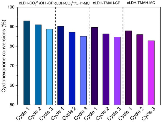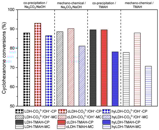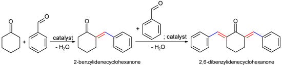 Among the investigated reactions in the presence of the LDH catalysts [36], aldol condensation, Claisen–Schmidt and Knoevenagel reactions, Michael addition, Baeyer–Villiger oxidation, Weitz–Scheffer epoxidation, nitriles hydrolysis, alkylation, and acylation or polymerization are most frequently considered as references. Specifically, Claisen–Schmidt condensation [37,38] is dedicated to the formation of new C–C bonds. The condensation of cyclohexanone and benzaldehyde to mono-, 2-benzylidene-cyclohexanone, or di-condensation, 2,6-dibenzylidene-cyclohexanone, is also an important subject [39,40,41,42,43,44,45,46]. However, the Claisen–Schmidt condensation has some limitations due to the possibility of the appearance of side reactions, such as self-condensation, as an effect of the additional presence of the acid sites.